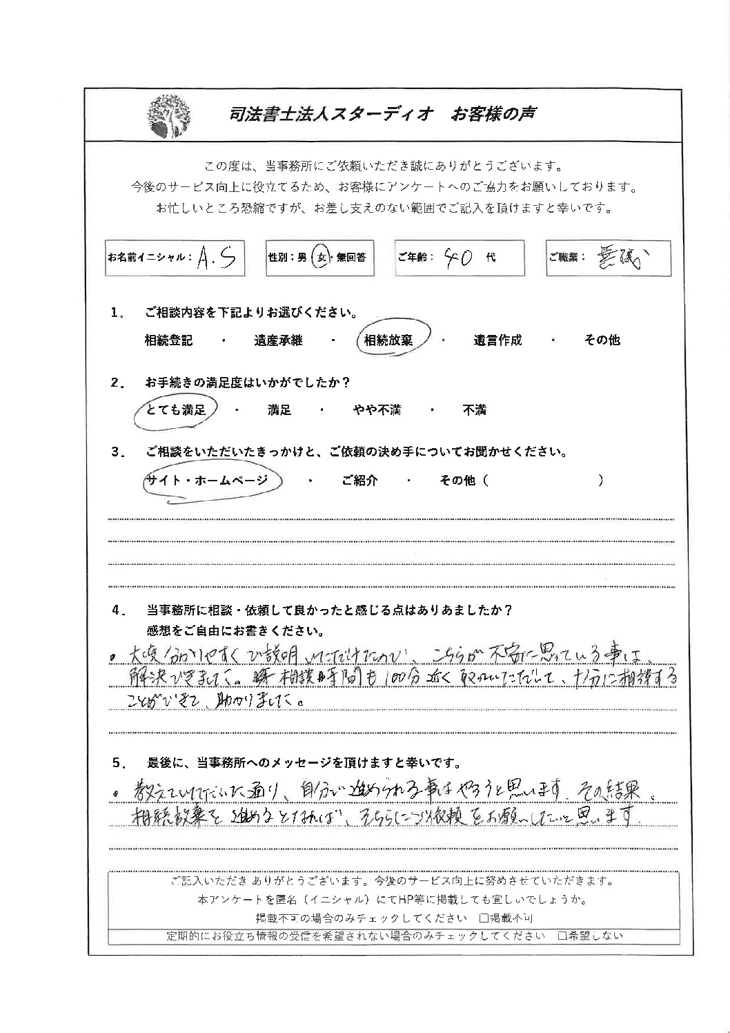 ◆ ご相談いただいたきっかけ サイト・ホームページ ◆感想・相談して良かったこと 大変分かりやすくご説明いただけたので、こちらが不安に思っている事は解決できました。相談時間も100分近く取っていただいて、十分に相談するこ […]続きを見る