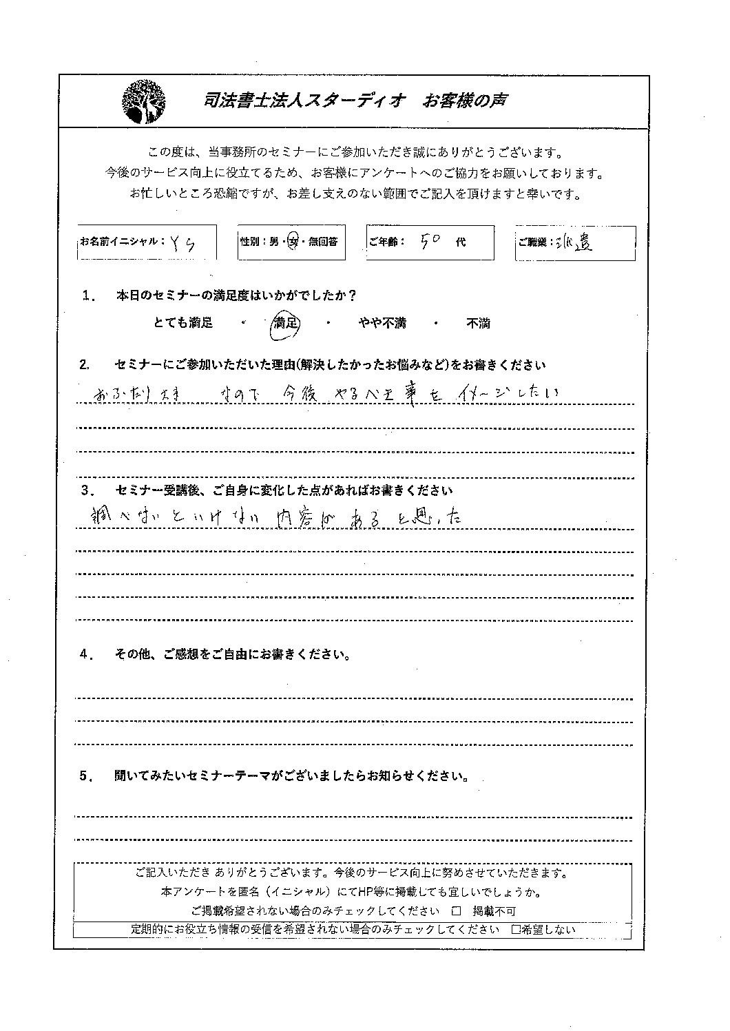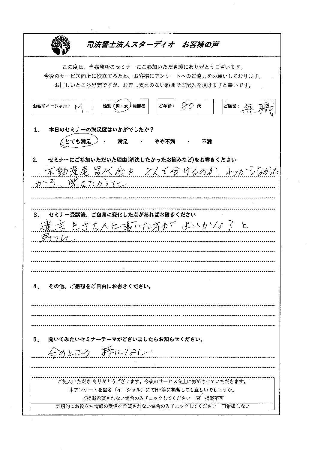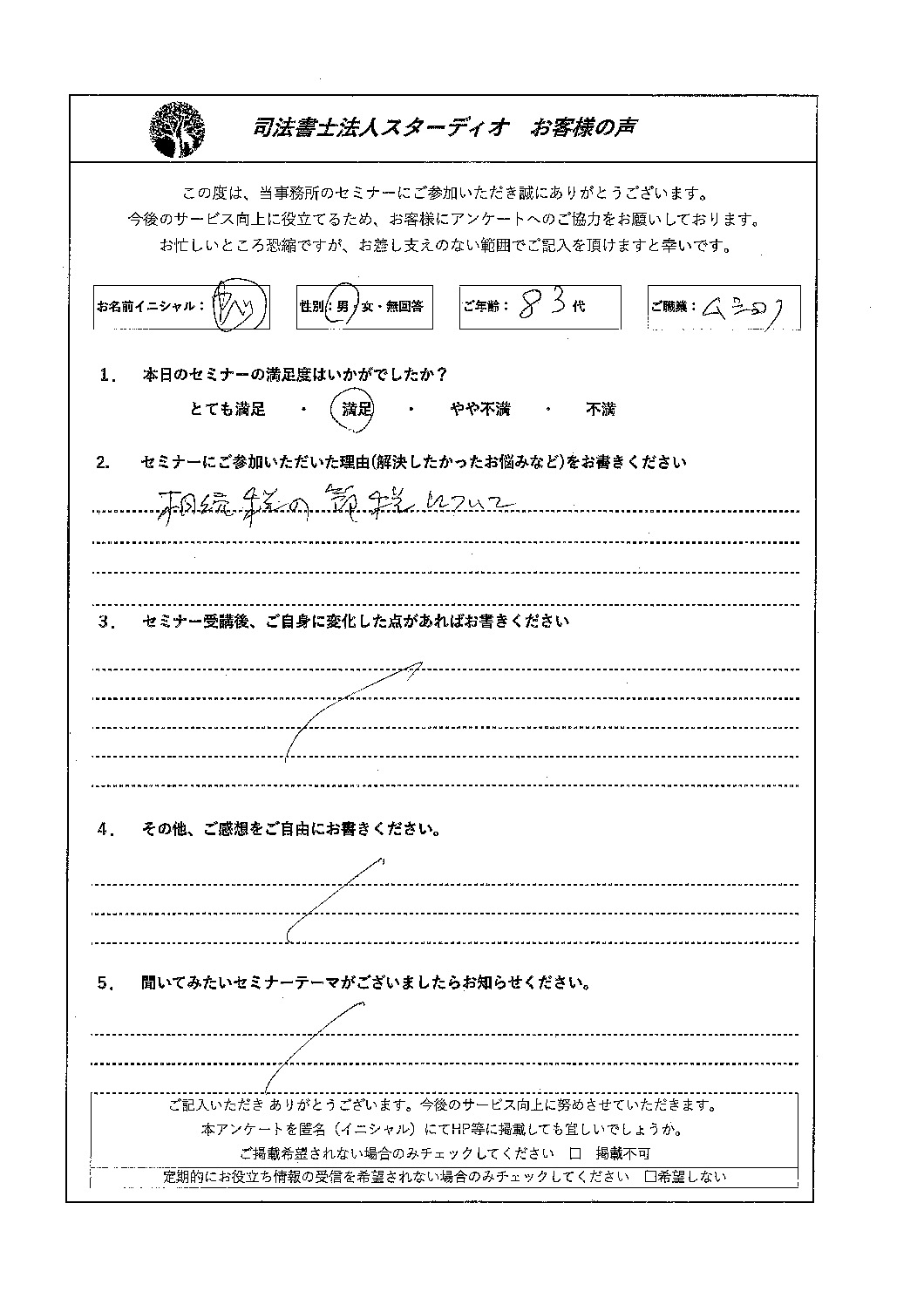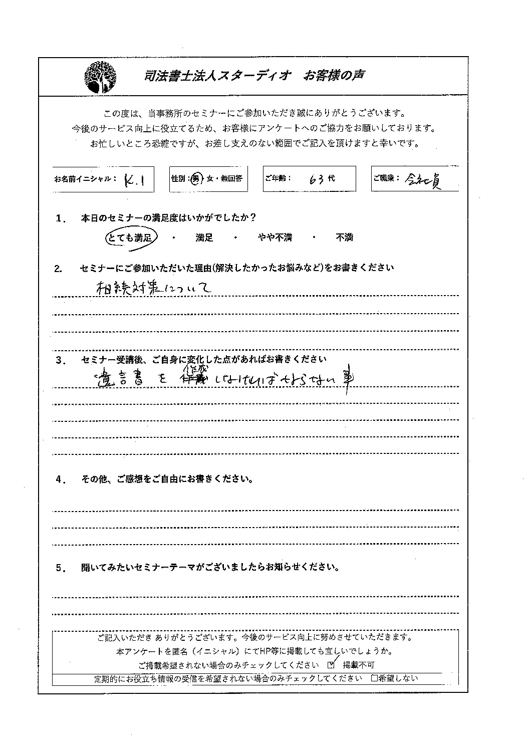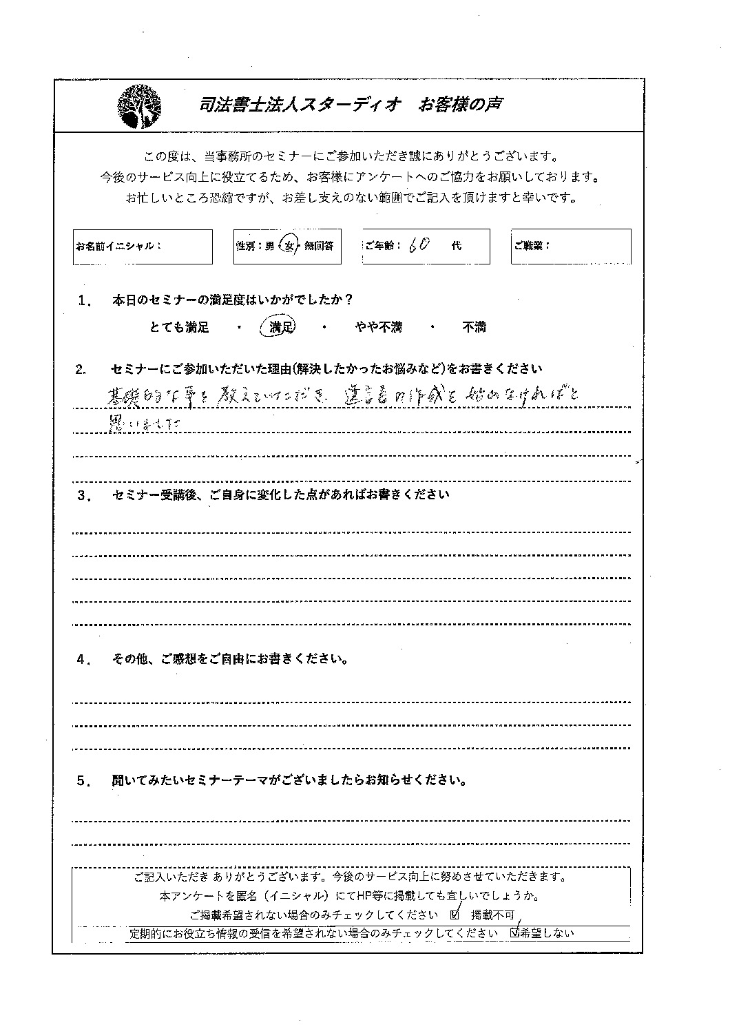 ◆ セミナーにご参加いただいたきっかけ 基礎的な事を教えていただき、遺言書の作成を始めなければと思いました。続きを見る