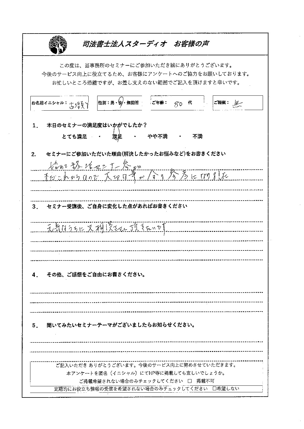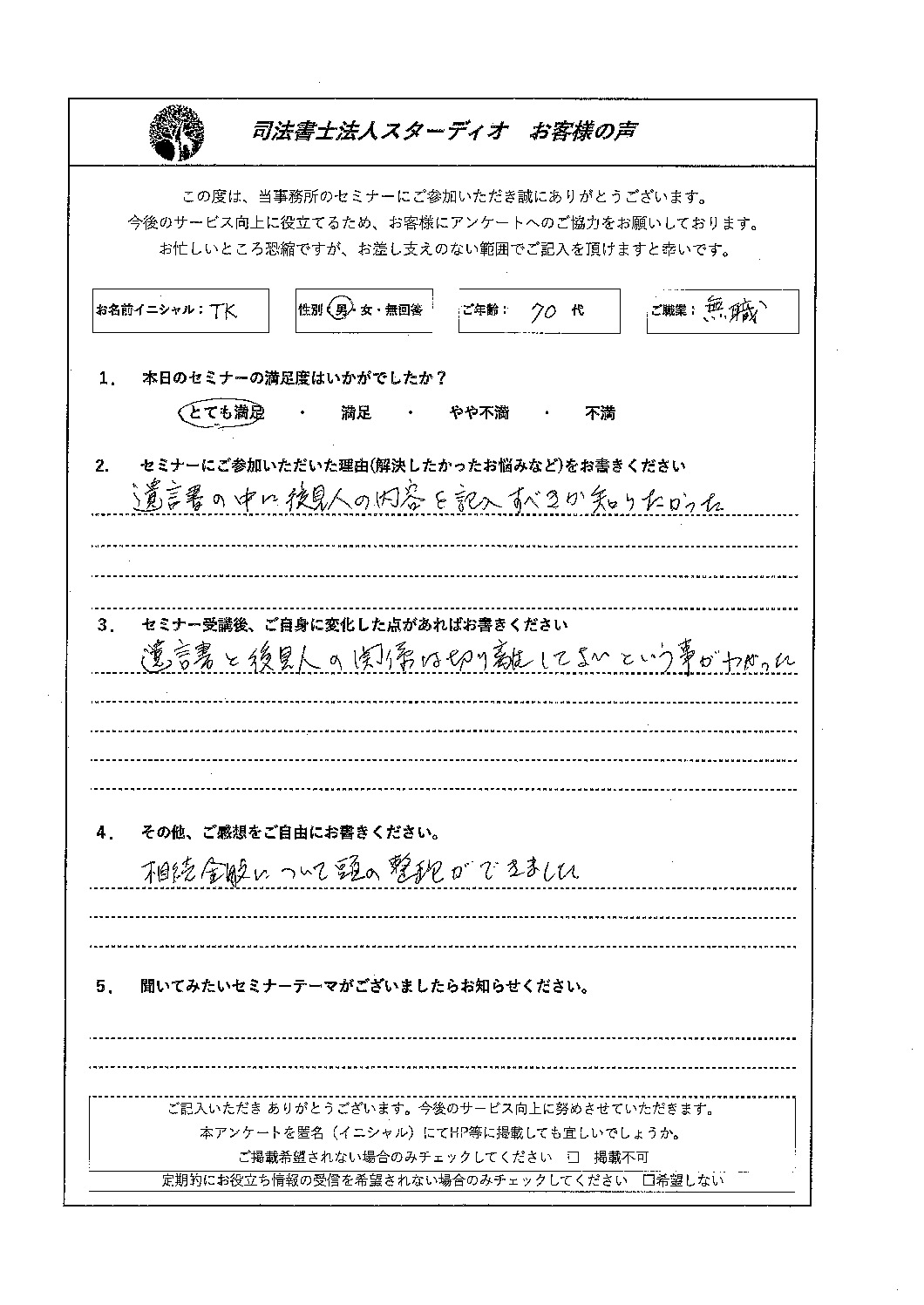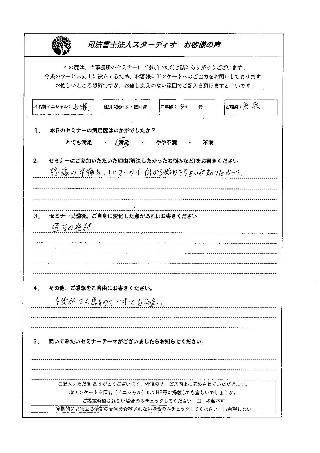◆ セミナーにご参加いただいたきっかけ 終活の準備をしていないので何から始めたらよいか知りたかった。 ◆セミナー受講後、ご自身の変化 遺言の検討 ◆その他のご感想 子供が2人居るので、一寸と目的違い続きを見る